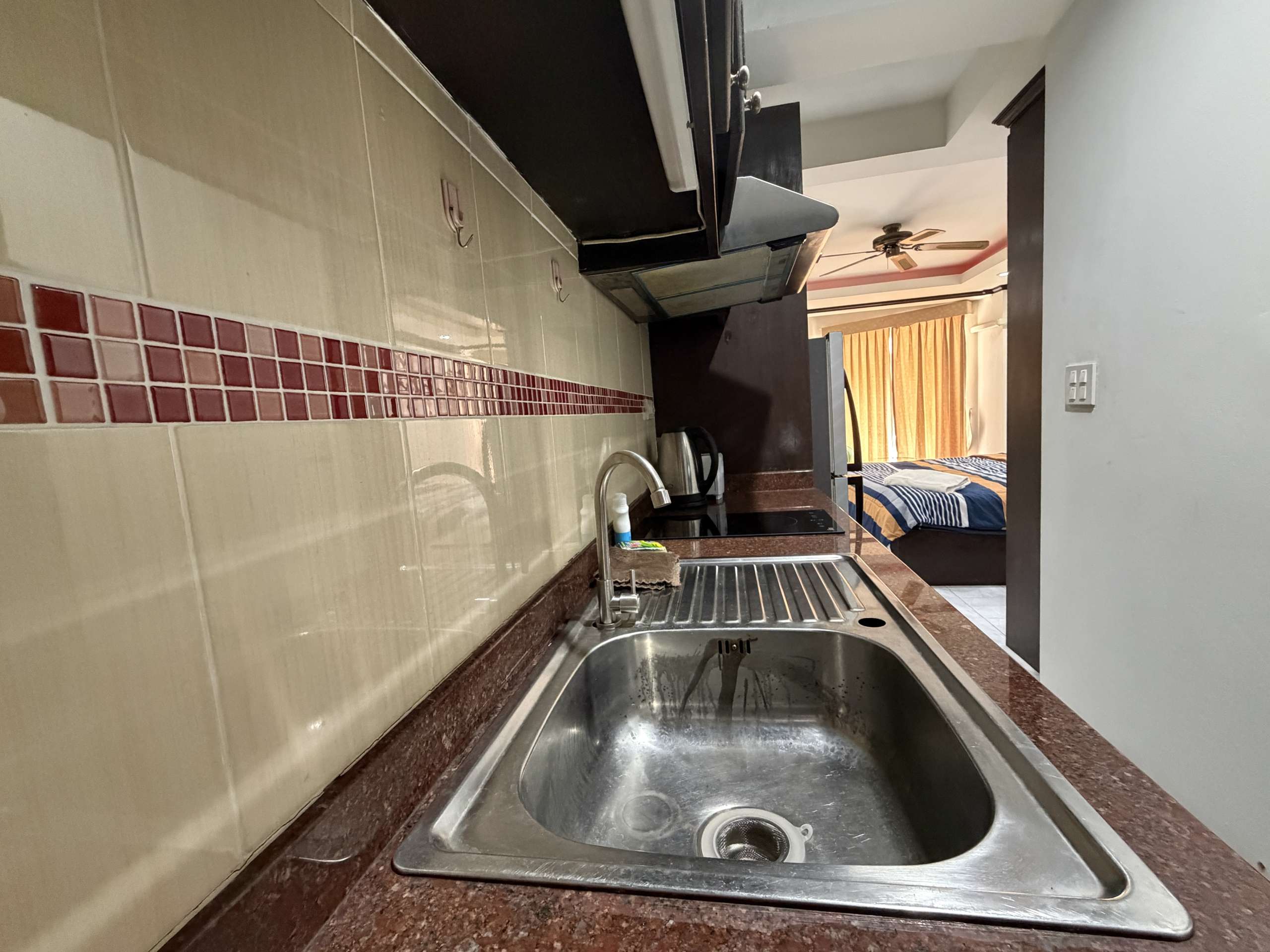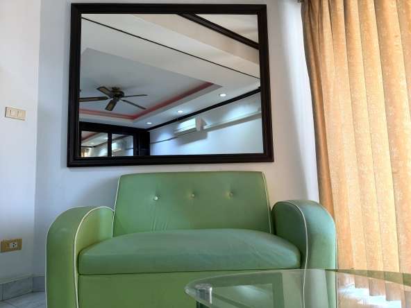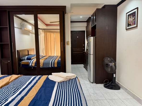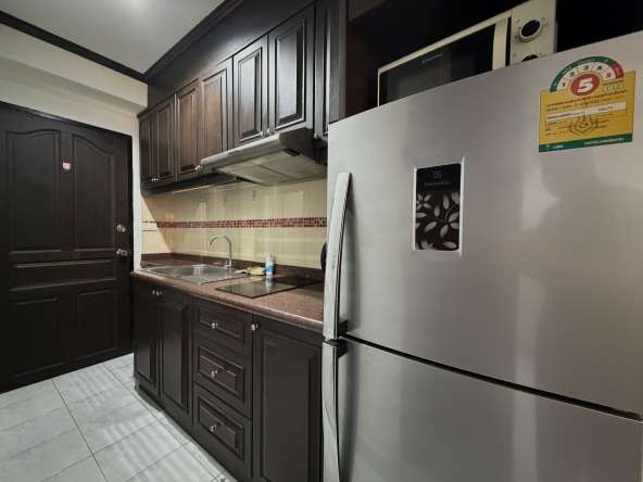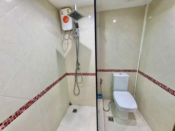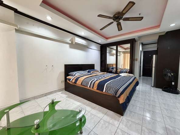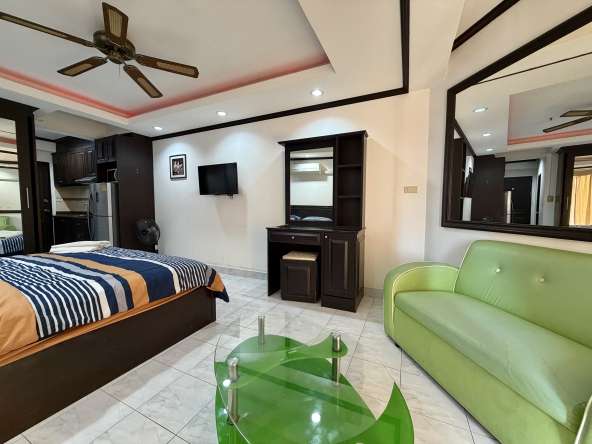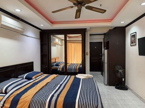 This 9th-floor studio condo offers 30 sqm of comfortable living space with sea views in the popular Jomtien Beach Condominium complex. Fully furnished and move-in ready, the unit features a fully equipped kitchen, a modern bathroom with bathtub and shower, and stylish feature ceilings, making it ideal for both residential living and rental investment.